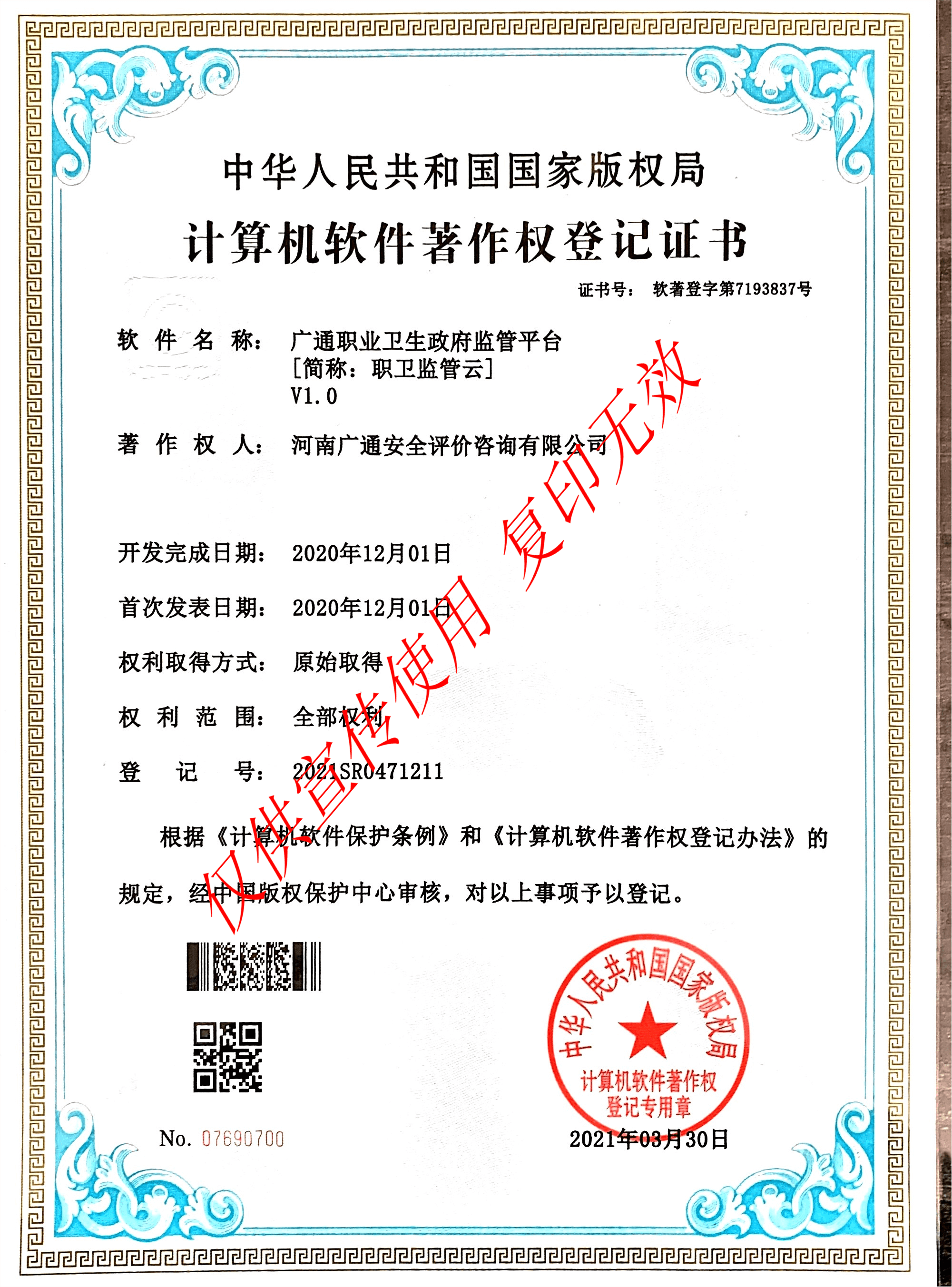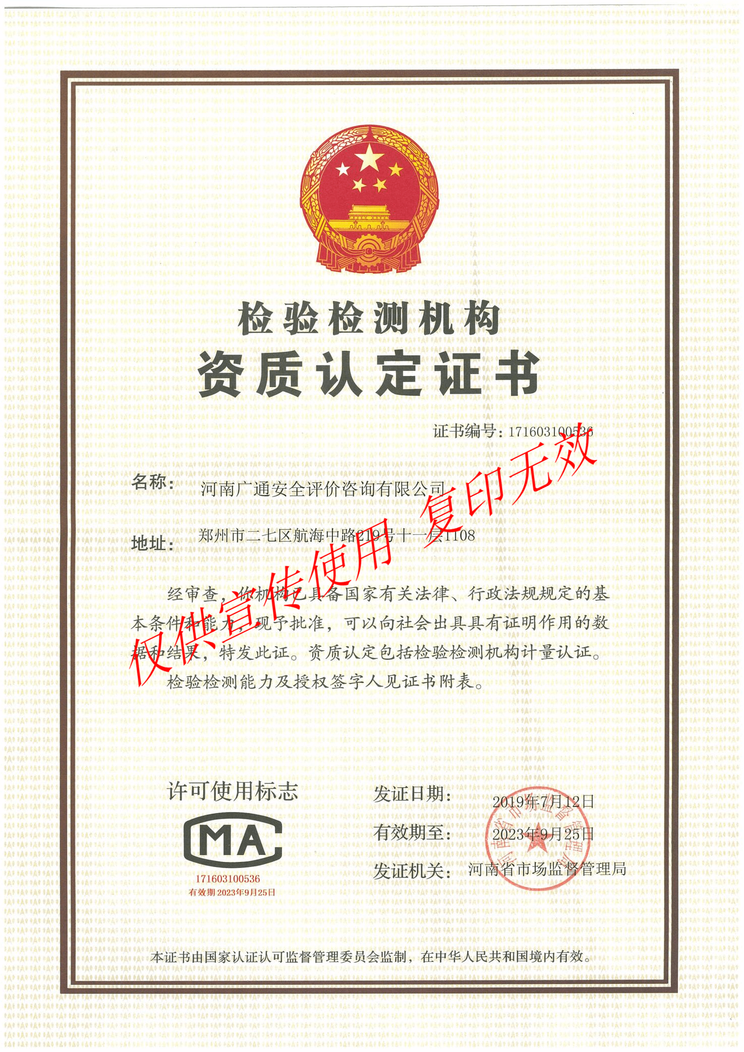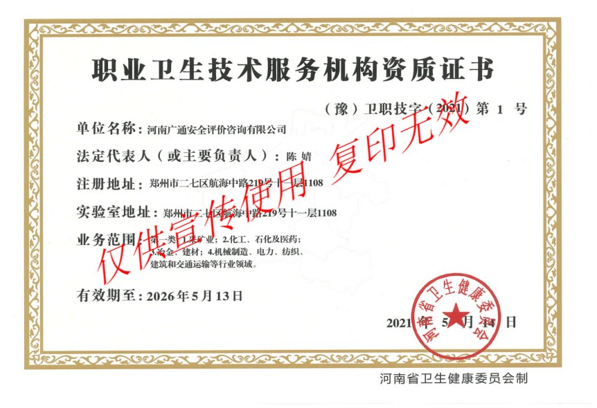 河南广通安全评价咨询有限公司始建于2014年3月,是一家依法登记注册并取得河南省卫健委颁发的职业卫生技术服务机构资质的第三方专业技术服务机构。